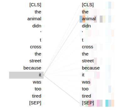 BertViz — attention from "it," layer 9. Multiple heads converge on "animal."