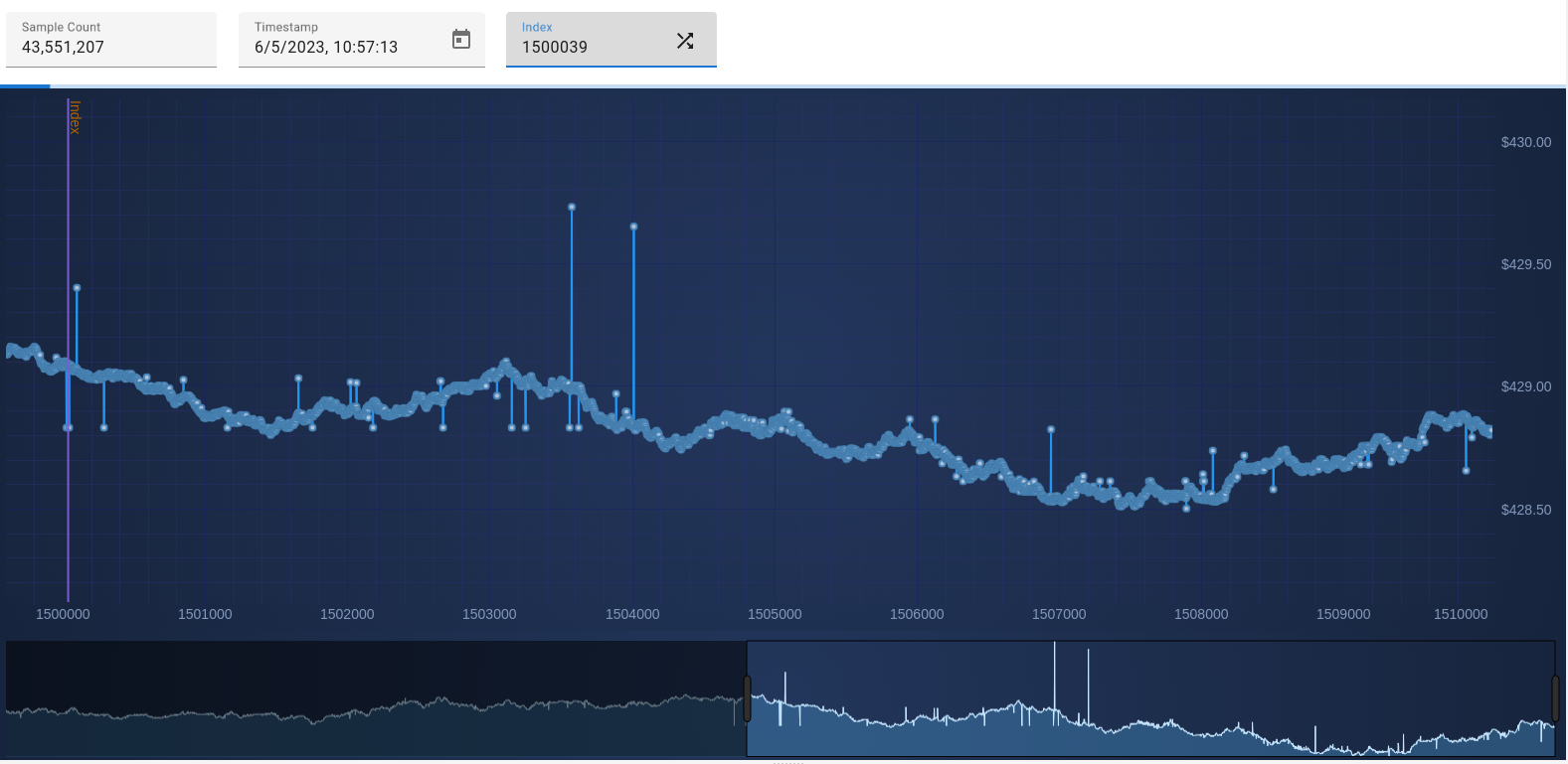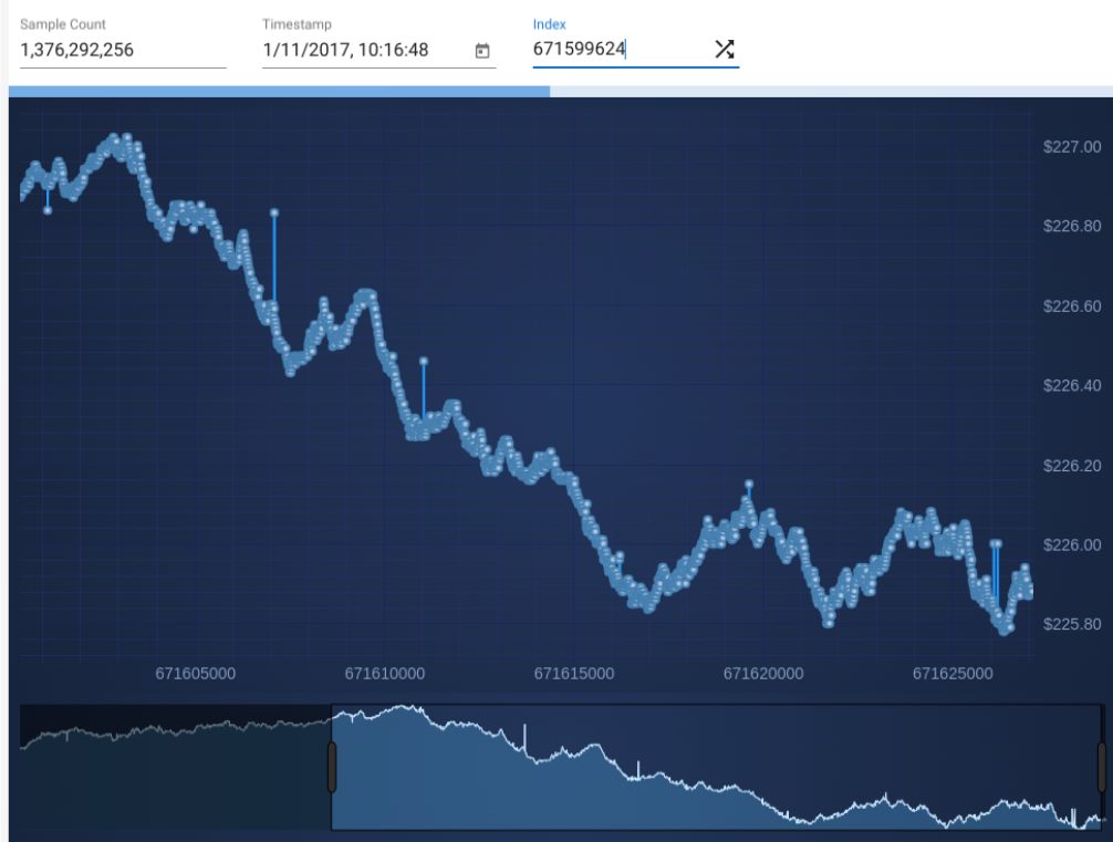 The LIT feature store is engineered to handle models built on exceptionally large datasets, providing powerful tools for efficient data exploration. Users can interact with datasets containing billions of data points with ease, thanks to rapid random access capabilities that deliver results in under 30 milliseconds. The reference architecture leverages WebAssembly technology to power a responsive chart view, which allows users to zoom in and out of data seamlessly.